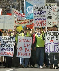 Kaum ist die 90-days-bill so gut wie vom Tisch (die Maori Partei hat angekündigt in dritter Lesung geschlossen gegen den Entwurf zu stimmen), geht’s schon wieder rund in der Gewerkschaftsbewegung. Der australische Supermarktbetreiber Progressive Enterprises (Woolworth, Foodtown, Countdown) hat 600 Arbeiterinnen und Arbeiter ausgesperrt. Vorausgegangen war ein kleiner, nur 48 Stunden andauernder Streik der Distributionsarbeiter. Progressive hat landesweit drei Verteilzentren und zwar in Auckland, Christchurch und Palmerston North. Früher gab es mal einen Tarifvertrag, doch die Geschäftsführung wollte die Gewerkschaft aus ihrem Unternehmen heraus haben und schloss kurzerhand die Zentren in Auckland und Christchurch, um sie an anderer Stelle wieder zu eröffnen und die zuvor entlassenen Mitarbeiter zu schlechteren Konditionen wieder einzustellen. Am Standort Palmerston North ist ihnen das nicht gelungen, da keine Räumlichkeiten zur Verfügung standen. Die Jungs und Mädels in Auckland und Christchurch verdienen nun also gerade mal den Mindeslohn, während die Kolleginnen und Kollegen in Palmerston North zwar immer noch extrem wenig, jedoch über dem Mindestlohn verdienen und nach 20-jähriger Betriebszugehörigkeit auch Anspruch auf eine zusätzliche Woche Urlaub pro Jahr haben (derzeit vier Wochen statt der gesetzlich vorgeschriebenen drei, was sich aber im April nächsten Jahres ändern wird, wenn der gesetzliche Mindesturlaub auf vier Wochen angehoben wird). Das ist nicht gerecht und da jedem neuseeländischen Gewerschaftsmitglied in einem Unternehmen mit noch mindestens einem weiteren Gewerkschaftsmitglied das Recht auf einen Tarifvertrag zusteht, sind die zuständigen Gewerkschaften NDU und EPMU mit Progressive Enterprises in Verhandlungen getreten. Da man sich nicht einigen konnte, sind die Arbeiter in einen 48-stündigen Streik getreten und fanden sich danach ausgesperrt vor. Momentan besteht das Angebot, dass sie gern an ihren Arbeitsplatz zurück kehren können, sonfern sie ihre Gewerkschaftsmitgliedschaft aufgeben, auf den Tarifvertrag verzichten und sich mit dem Mindestlohn von 10,25 Dollar (= etwa 5 Euro) zufrieden geben. Das ist schlichtweg Erpressung und Verletzung von Grundrechten und erpressen lassen möchte sich eigentlich niemand. Also bleiben sie vor den Toren des Unternehmens, allerdigs unbezahlt. Im Rahmen einer Arbeitsrechtskonferenz in der letzten Woche haben wir Gewerkschaften die Chance bekommen, einige der Arbeiter und deren Partnerinnen kennen zu lernen. Ich war sehr beeindruckt davon, wie tapfer, stolz und stark diese Menschen auf ihre Rechte beharren. Leider erhalten sie im Moment kein Gehalt, was einige schon zum Aufgeben gezwungen hat – 26 junge Männer haben am Freitag ihre Arbeit wieder aufgenommen und auf ihre Rechte verzichtet. Menschen, die knapp über dem Mindestlohn verdienen, haben nunmal keine fetten Sparkonten, von denen sie sich bedienen können. Teile der neuseeländischen Bevölkerung unterstützen die betroffenen Familien stark finanziell; es gibt Straßensammlungen, man kann telefonisch spenden (beim Anruf unter 0900-LOCKOUT werden automatisch 20 Dollar auf der nächsten Telefonrechnung belastet) oder auch direkt auf ein Sonderkonto bei der BNZ einzahlen. Es ist sehr wichtig, dass der Kampf gegen diesen Multimilliondollar-Riesen (1,2 Milliarden Dollar Gewinn im letzten Jahr, der CEO bekommt jährlich 8,5 Millionen Dollar, was pro Tag wesentlich mehr ist, als die Arbeiter im ganzen Jahr verdienen) von den Arbeitern gewonnen wird, ansonsten werden sicher viele größere Unternehmen in Zukunft ihre Angestellten einfach aushungern lassen. Am Samstag sind Jenny und ich dann zu einer Kundgebung nach Palmerston North gefahren. Politische Parteien haben dort weitere Unterstützung zugesagt, die Gewerkschaft der Hafenarbeiter hat angekündigt, Warenlieferungen an Progressive nicht mehr abzuladen, die Krankenschwesterngewerkschaft “adoptierte” gleich eine ganze Familie die finanzielle oder materielle Unterstützung braucht und viele andere haben weitere Geldspenden zugesagt. Leider wird der Sachverhalt in der Presse immer noch falsch dargestellt. Weite Teile der neuseeländischen Bevölkerung denken, dass die Arbeiter streiken und auch während der Kundgebung am Samstag wurden sie manchmal (wenn auch zum Glück selten) beschimpft, sie sollen doch einfach wieder arbeiten gehen. Wollen sie ja, der Arbeitgeber lässt sie nur nicht. Heute ist Tag 17 der Aussperrung, in der nächsten Woche geht es nochmal zur Mediation. Ich bin sehr gespannt, ob sich Gewerkschaften und Progressive dort einig werden…