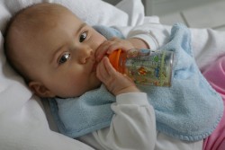 Marie kann jetzt schon ganz ohne Hilfe ihr Flaeschchen selbst halten!!!