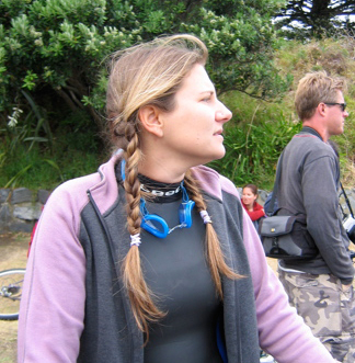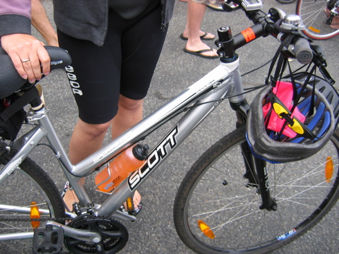 Zum Glueck war die Strecke ein wenig verkuerzt worden (sah zumindest so aus) und dort wo wir schwimmen mussten war das Meer auch nicht sehr tief, so dass die meisten Frauen sich durchaus huepfend fortbewegen konnten. Das habe ich dann auch mal gemacht, denn mir purem Schwimmen bin ich ueberhaupt nicht vorwaerts gekommen. Dann ging es raus aus dem Wasser, fix den Wetsuit ausgezogen, T-Shirt und Shorts ueber den nassen Badeanzug geworfen, Schuhe an und ab auf’s Rad. Ab da habe ich es gehasst. Es gibt fuer mich persoenlich nur wenig unangenehmeres als in nassen Klamotten auf dem Fahrrad zu sitzen. Was fuer eine Qual! Inzwischen kreisten meine Gedanken lediglich darum, in was fuer einen Scheiss ich mich da hab reinquatschen lassen und ich sah meine Chancen schwinden, ueberhaupt irgendwie das Ziel zu erreichen. Denn 12 Kilometer in den triefenden Buchsen radeln und dann noch 4 Kilometer rennen, das habe ich nicht vor mir gesehen. Ich habe also kurzerhand die kuerzere Radstrecke eingeschlagen und bin nur 6 Kilometer geradelt. An dieser Stelle muss ich auch mal Cathy also Mega-Motivator loben – an jeder kritischen Stelle stand sie schon wenn ich ankam, ist stellenweise mitgerannt, hat mir meinen iPod fuer’s Rennen angegeben, meine Sonnenbrille und Wasserflasche getragen und mich immer wieder angespornt. Nach dem Rennen kam sie mir schon 300 Meter vorm Ziel entgegen und ist bis zum Finisch mit mir mitgelaufen. Danke, Cathy! JJ, deren Idee die ganze Aktion ja urspruenglich war, hatte ich schon vorm Schwimmen verloren, da wir in unterschiedlichen Startgruppen eingeteilt waren. Erst am Ziel haben wir uns wieder gesehen. Mein Zeit war 1 Stunde und 4 Minuten, was nicht heldenhaft, aber ok ist. Mein Ziel war 1 Stunde 20 und waere ich die extra 6 Kilometer Fahrrad gefahren, waere ich damit auch hingekommen. Auch beim Laufen, habe ich jede Minute gehasst und war sogar drauf und dran, die olle nasse Hose auszuziehen, hab’s mir dann aber doch verkniffen. Ich bin eindeutig nicht leidensfaehig genug fuer Triathlon, trotzdem bin ich stolz, dass ich es mal ausprobiert und auch geschafft habe! Das naechste mal versuche ich einen Duathlon – ich glaube, wenn ich das Schwimmen vorher weglasse, werde ich mich. wesentlich besser gelaunt durch den Wettkampf schlagen.