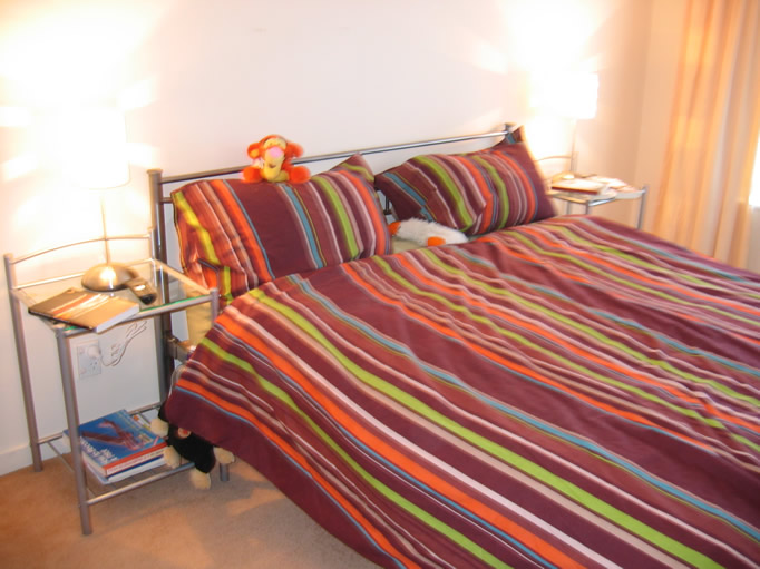 So langsam wird’s gemütlich in unserer Wohnung. Das Schlafzimmer ist schon fast fertig, es fehlen nur noch ein paar Bilder an den Wänden und sogar unsere Diskussion, ob wir noch ein Kommode brauchen/wollen nähert sich einer Entscheidung. Es ist also Zeit, mal einen Zwischenbeweis zu liefern. Die Nachttischchen sind neu und auch die Lampen darauf, die man leider auf dem Foto nicht wirklich gut erkennen kann. Kai hat darauf bestanden, Lampen zu kaufen, die bei Berührung angehen, wir haben jetzt also ein Schlaflicht, wenn wir sie einmal berühren, ein leichtes Licht, wenn wir sie zweimal antatschen und ein helles Leselicht, wenn wir es zum dritten mal tun. Der nächste Patscher schaltet sie dann wieder aus. Und so ist es mir weider einmal nicht gelungen, elektronischen Spielkram aus dem Schlafzimmer heraus zu halten… ;)