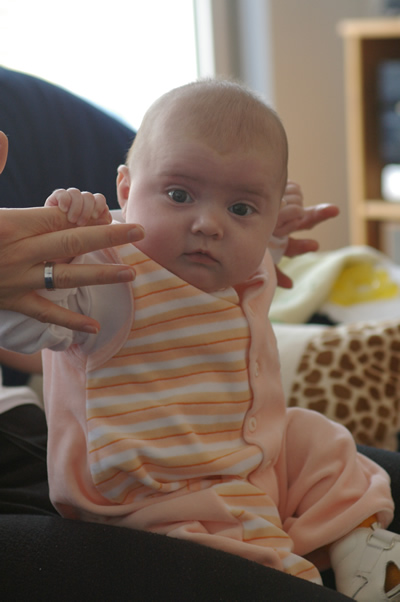 Marie kann sich jetzt schon aus dem Halbsitzen an Ninas Fingern in eine Sitzposition ziehen! Ausserdem haben wir schon mehrfach miteinander telefoniert. Zwar verstehe ich noch nicht was sie sagt, aber sie brabbelt ohne Unterbrechung in den Telefonhörer. Zumindest wenn sie wach ist; wenn sie noch schläfrig ist, kommt es auch schon mal vor, dass sie als Reaktion auf den Telefonhörer einfach nur pupst, aber das nehme ich dann nicht persönlich. Meine große Sorge im Moment ist, dass sie das Wort für “Telefon” oder “Telefonhörer” nicht lernen wird, sondern irgendwann einmal nur “Tante” oder noch viel schlimmer “Diane” dazu sagen wird. Nina braucht unbedingt eine Webcam, damit noch ein visueller Reiz dazu kommt, wenn Marie mit mir telefoniert… ;-)