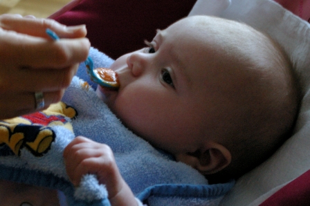 Marie hat zum ersten mal feste Nahrung gegessen. Es gab Moehren mit Kartoffeln…