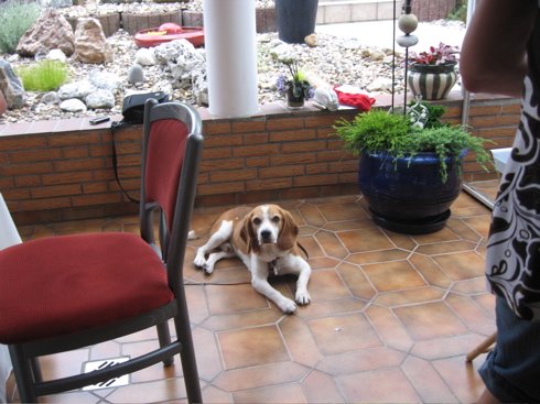 Bono hat die ersten 9(!) Jahre seines Lebens in einem Kaefig in einem Versuchslabor verbracht. Dort hat er regelmaessig seinen Samen dazu hergeben muessen, um neue kleine Beagles zu produzieren, die dann fuer ganz fiese Versuche missbraucht wurden. Nun ist Bono zu alt fuer weitere Nachkommen, und bekommt bei Micha und Christian endlich das Zuhause, das er verdient. Als “Familienmitglied” kam er natuerlich auch zu Nathalies Geburtstagsfeier am Mittwoch, und hat erstmal dafuer gesorgt, dass unsere Katze Miezi die Flucht ergriffen hat. Dabei haette sie wahrscheinlich keinen Grund dazu gehabt, denn Bono ist noch lang nicht an ein Leben ausserhalb eines Drahtkaefigs gewoehnt, und von daher sehr scheu und schuechtern. Anscheinend hat Miezi aus der Ferne das Geschehen genau beobachtet, denn sie kam gleich wieder angerannt, als Bono sich auf den Weg nach Hause gemacht hatte…